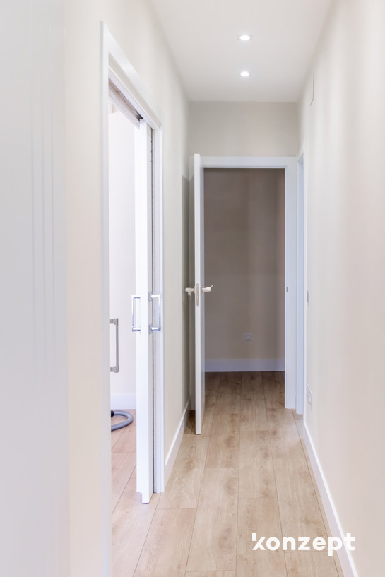 Diseñamos en la antigua zona de la cocina y el dormitorio de servicio, un precioso apartamento independiente con todos los servicios, trasladamos la nueva zona para la cocina hacia el hall de la vivienda y con acceso directo desde el salón, abrimos toda la antigua cristalera para recuperar la luz, ubicamos radiadores de diseño en todas las estancias y con la ayuda de la nueva carpintería interior en color blanco, los baños renovados con azulejos en tonalidades claras y un suelo de madera para potenciar esos blancos, conseguimos unos espacios renovados llenos de luz y donde se aprecia el valor real de las mismos, un lienzo en blanco con una segunda vida.