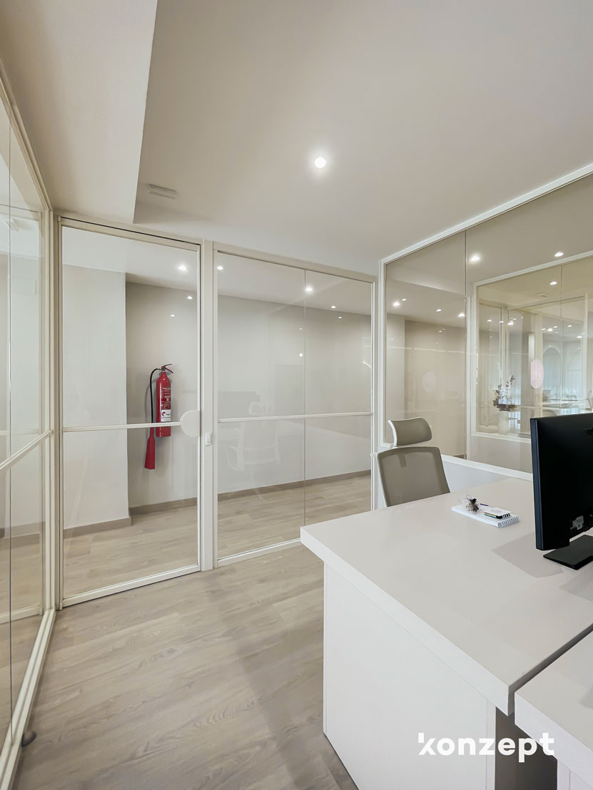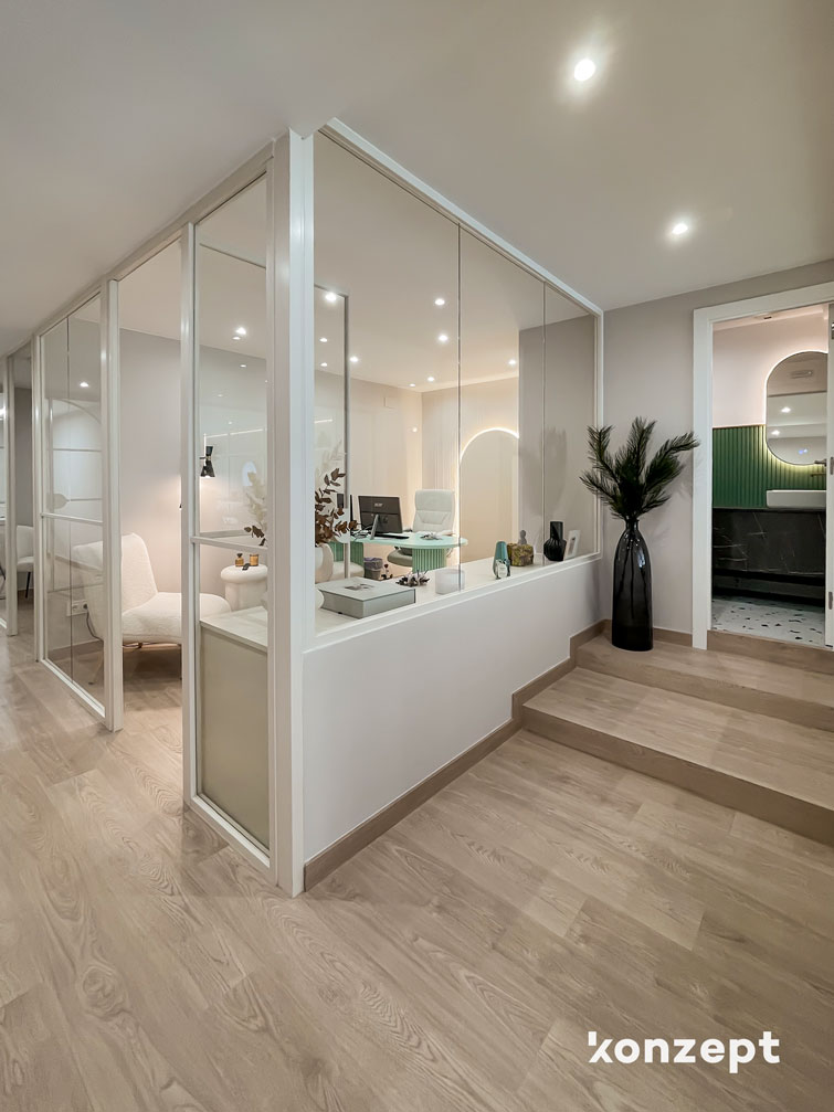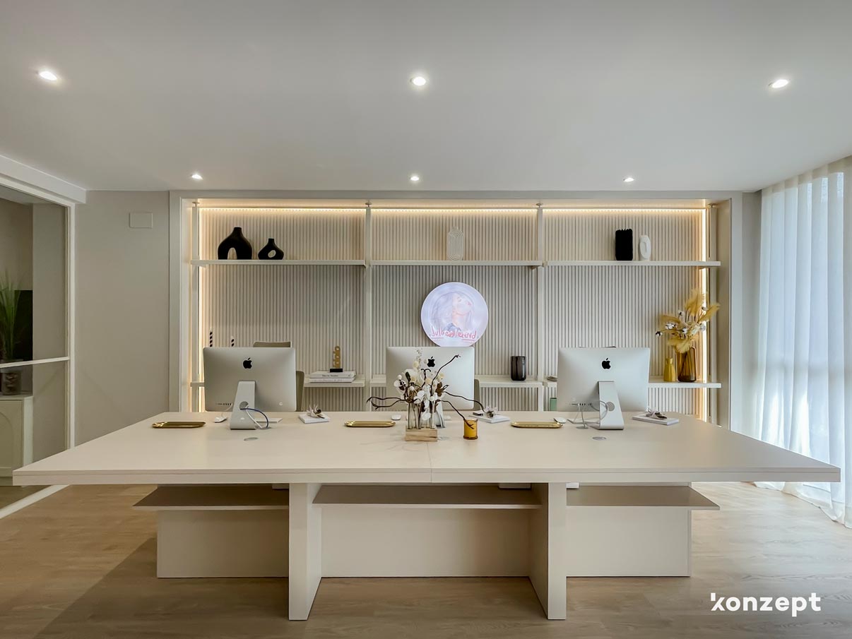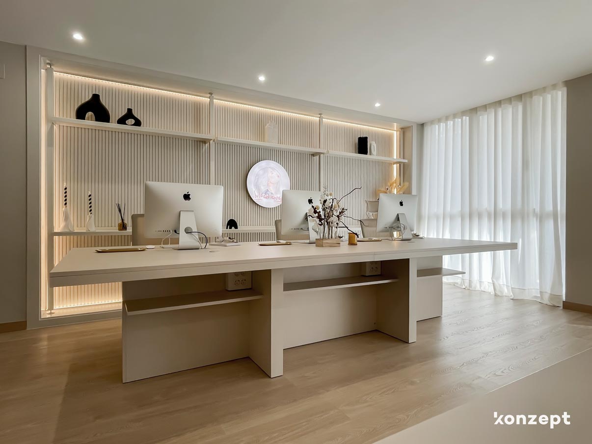 En este proyecto nos encontramos con un local que contaba con un gran ventanal y una magnífica entrada de luz natural, por ello proyectamos las particiones de los diferentes despachos interiores con mamparas de cristal para mantener la independencia necesaria sin renunciar a la luz. La seña de identidad son las estanterías metálicas con los logos retroiluminados y el panelado trasero que aporta una textura sutil y a la vez le confiere carácter y personalidad.