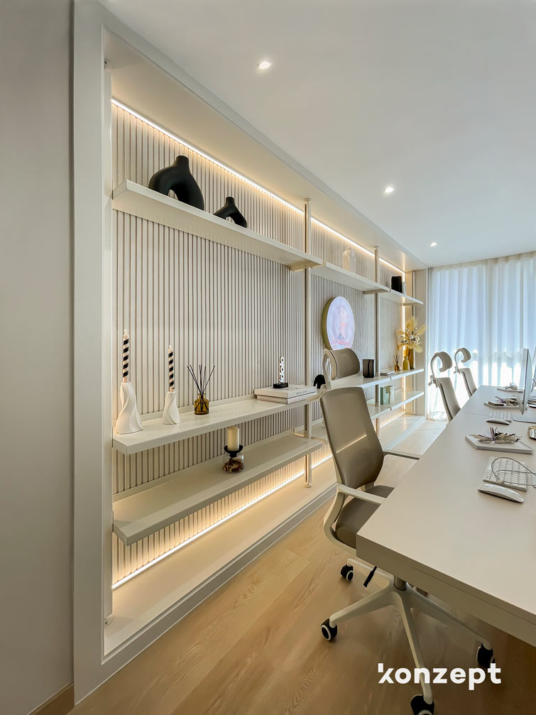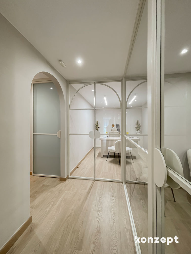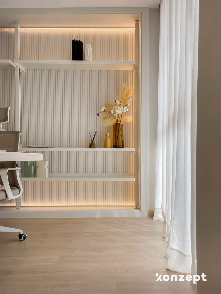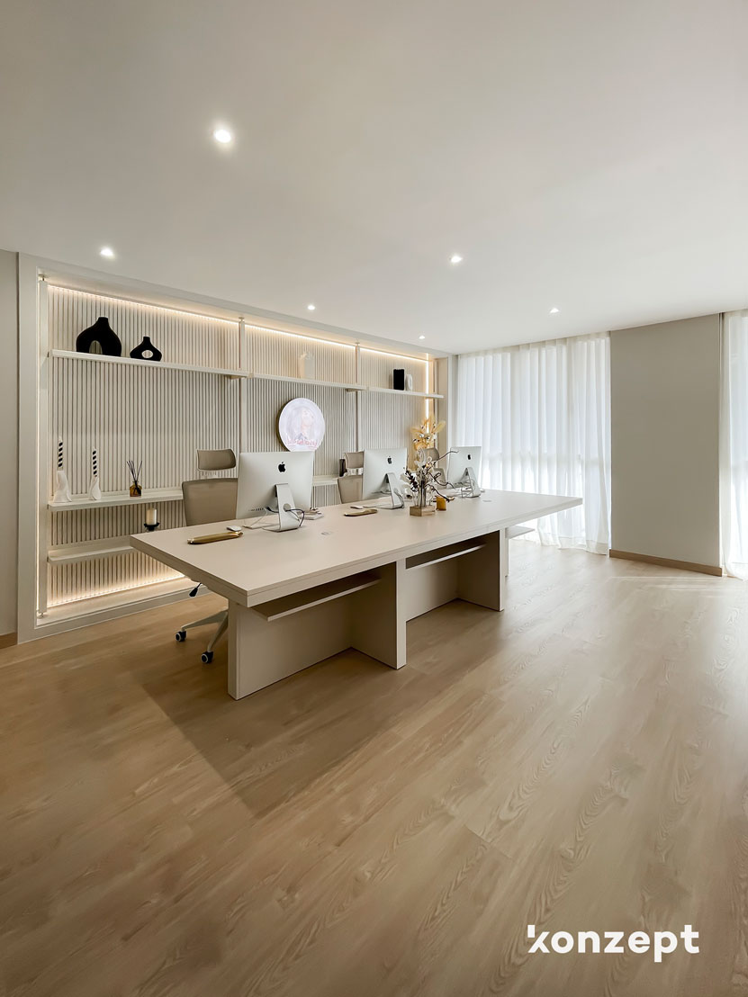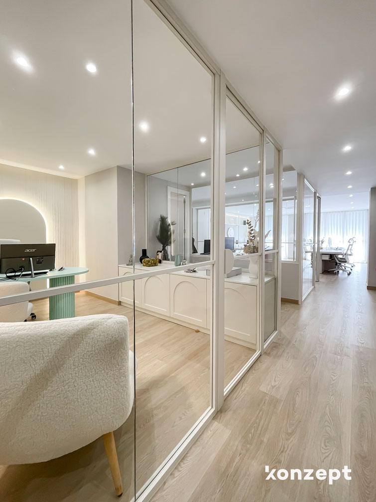 En este proyecto nos encontramos con un local que contaba con un gran ventanal y una magnífica entrada de luz natural, por ello proyectamos las particiones de los diferentes despachos interiores con mamparas de cristal para mantener la independencia necesaria sin renunciar a la luz. La seña de identidad son las estanterías metálicas con los logos retroiluminados y el panelado trasero que aporta una textura sutil y a la vez le confiere carácter y personalidad.